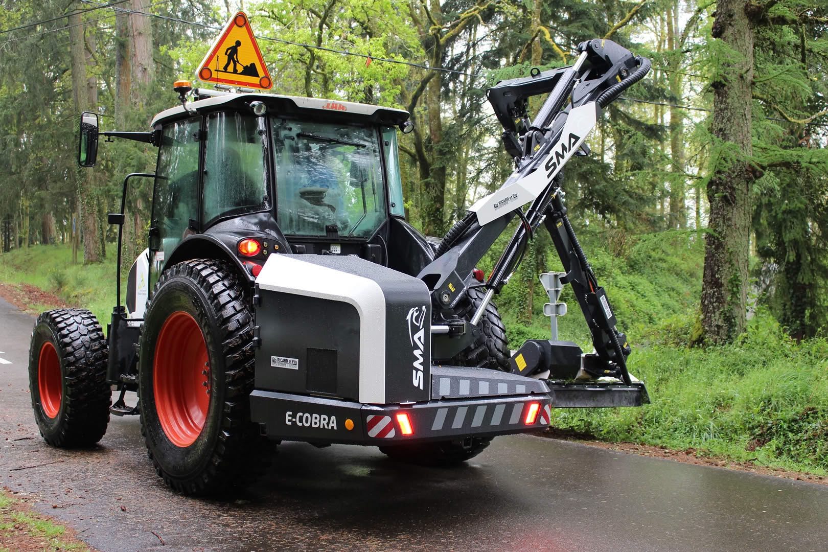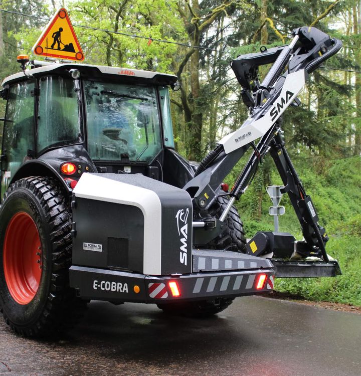 • Renversement de flèche intégré de série par vérin double chambre piloté en cabine, pour chemins étroits