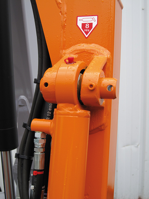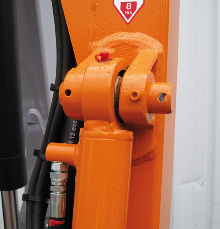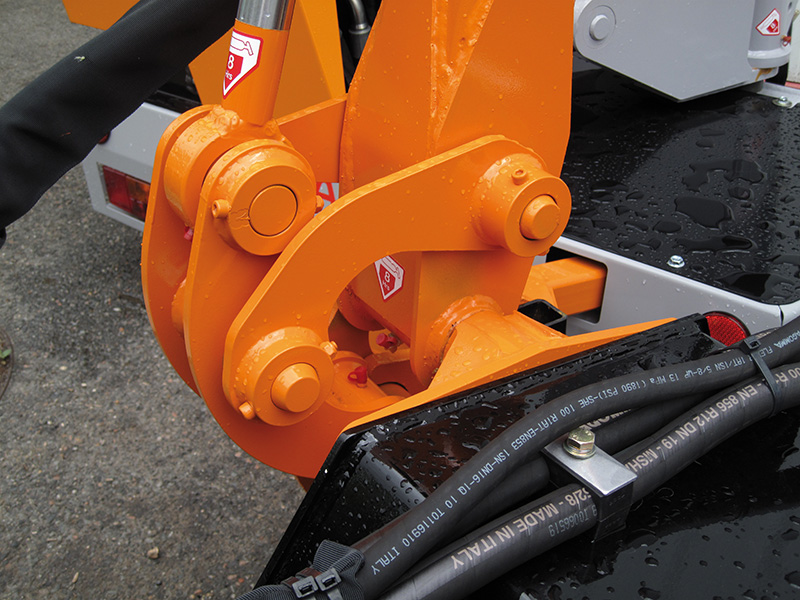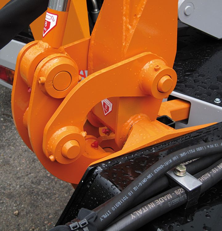 • Renversement de flèche intégré par vérin double chambre piloté en cabine, pour chemins étroits
